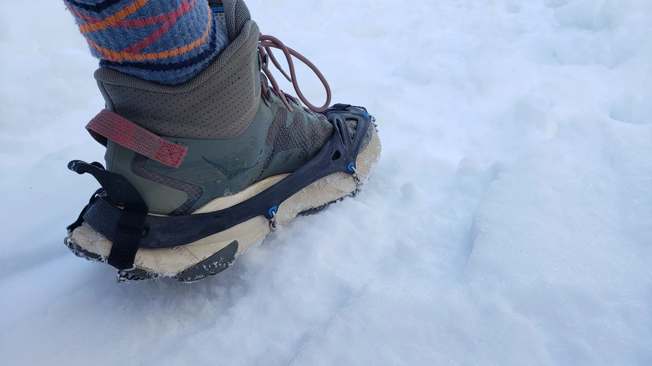 What kind you get matters. Technical climbing crampons meant for scaling frozen waterfalls differ dramatically from those meant for hiking or even glacier travel (the former generally feature longer points on the toes and must be worn with mountaineering boots instead of regular hiking boots). Crampon bindings are more substantial than the rubber straps used to attach spikes to footwear, making them much more difficult to put on or take off mid-hike. Before purchasing, make sure crampons are compatible with the type of footwear you plan to use (or conversely, if you expect to head into terrain that needs crampons, ensure you have the right footwear). Too often I have seen long-distance hikers attempting to strap lightweight crampons onto trail running shoes, ultimately leaving a precarious mess of dangling straps, crunched up toebox, and a terrifying potential for lateral slippage (both of the crampon and the wearer).