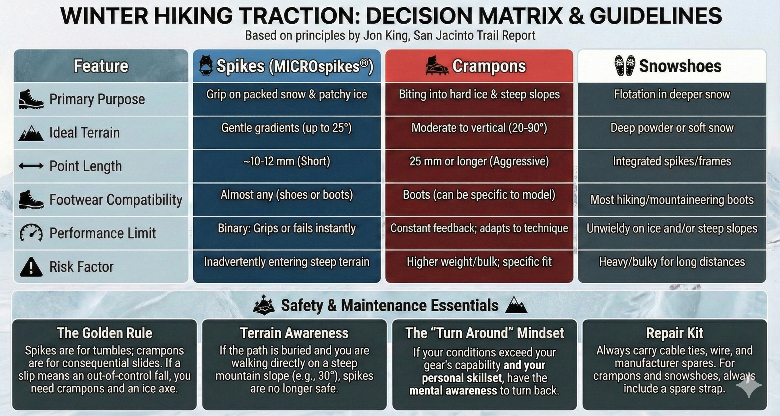 Hiking in snow and ice conditions, and choosing what traction to wear, is more art than science, and there is simply no replacement for practice and experience.