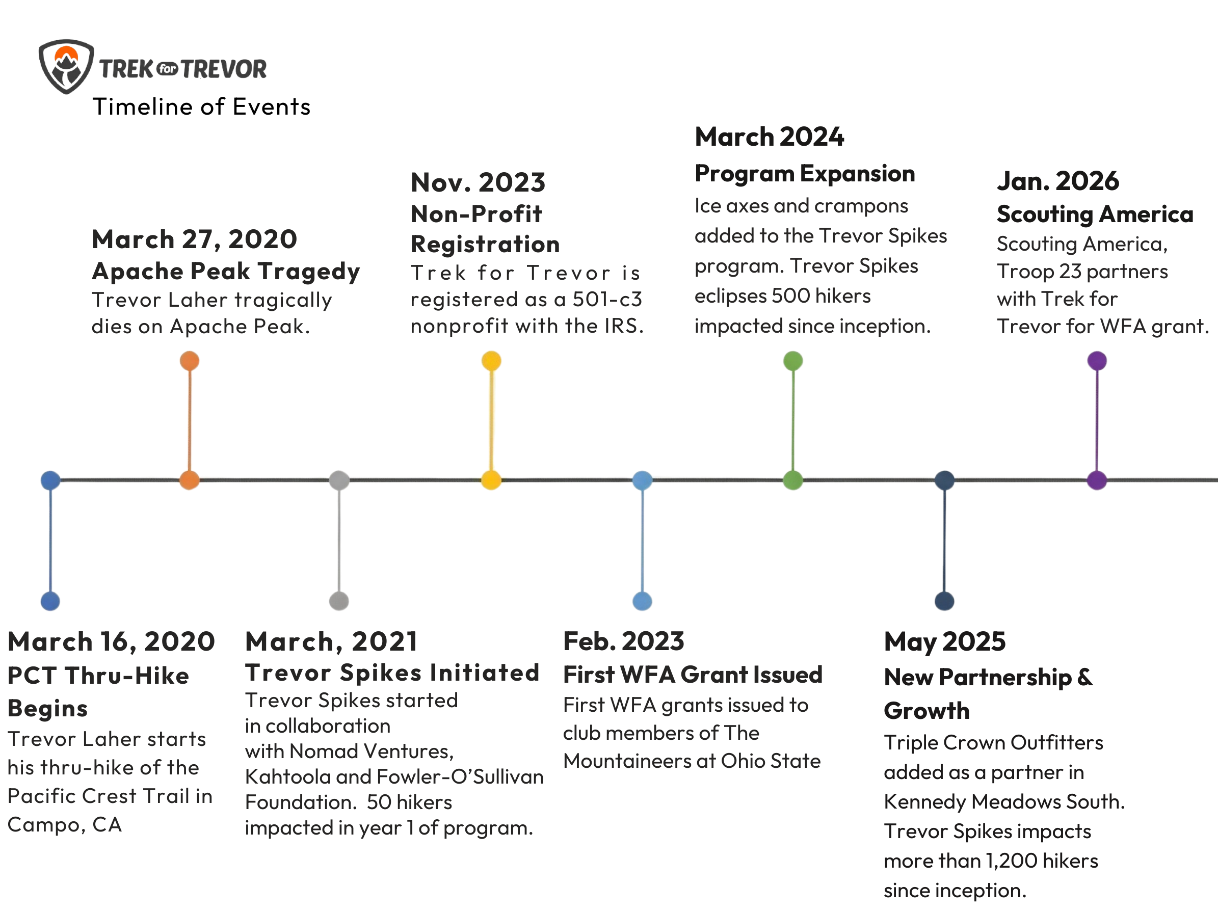 Trek for Trevor was formed to honor the life of Trevor “Microsoft” Laher who died on March 27, 2020 in his attempt to thru-hike the Pacific Crest Trail; a 2,652-mile trail which spans from Mexico to Canada through California, Oregon and Washington.